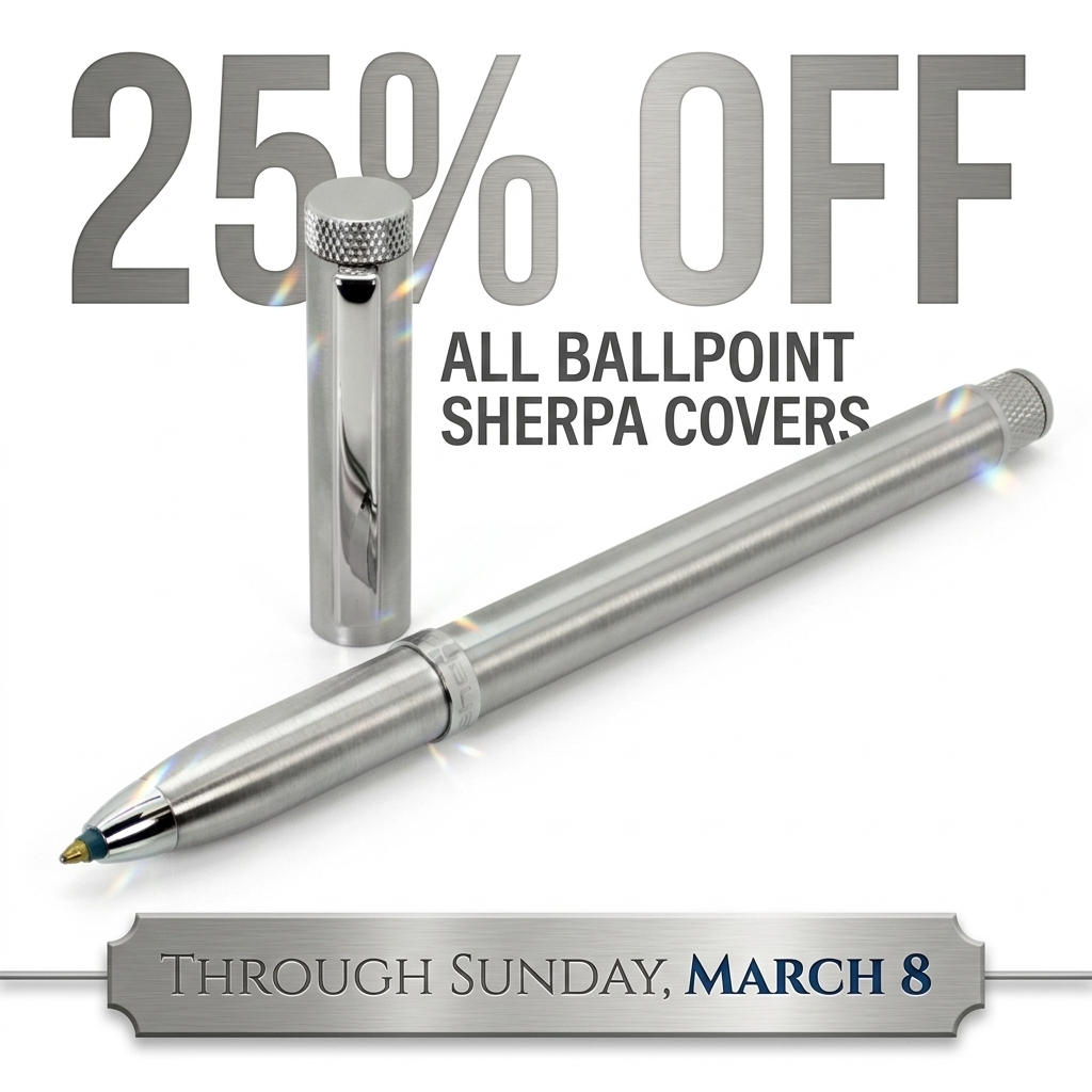 This weekend only, save 25% on ALL Ballpoint Sherpa pens! Just add your favorite Ballpoint Sherpa to your cart and it will automatically be discounted at checkout. Don't wait too long though, the sale ends Sunday, March 8th at Midnight.
