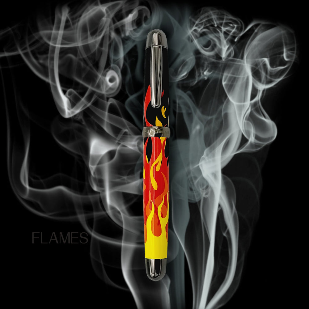 Fuel your ideas with the Sherpa Classic Flames—a pen that doesn’t just write, it roars. Featuring vivid red-orange flames silk-screened across a black barrel, this Sherpa is all about energy, attitude, and style. The gunmetal trim adds a sleek contrast, making this pen the ultimate choice for those who don’t blend in.